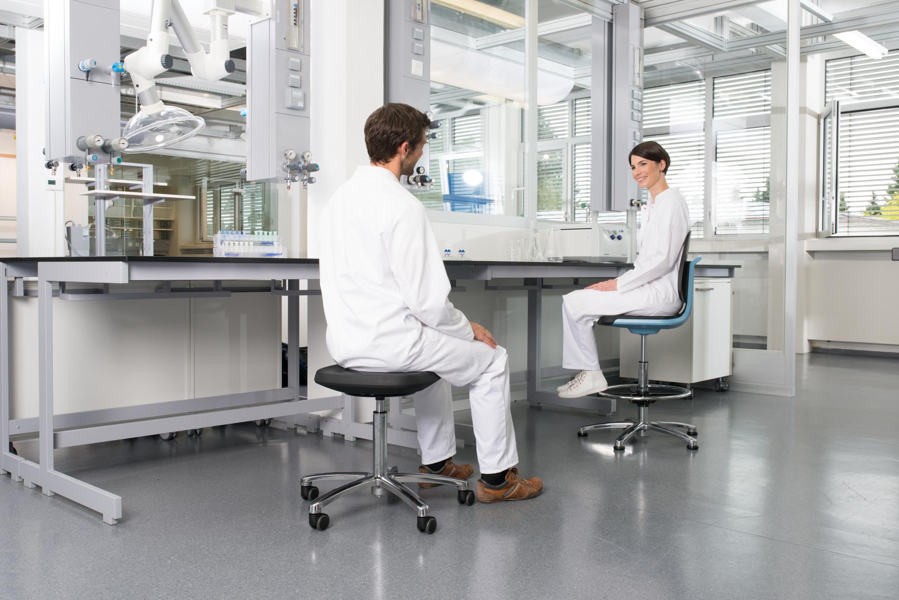 VilLab rekomenduoja darbo metu daryti pertraukėles. Kas 45 min. daryti 15 min. pertraukas pajudant. Darbui patariame įsigyti pakeliamą stalą. Tuomet darbą sėdint galėsite derinti su darbu stovint, kartu prie reguliuojamo aukščio stalo! Laboratorijos kėdė BIMOS LABSIT 9121 gali būti įsigyta su skirtingų spalvų eko oda arba su poliuretano paviršiumi.